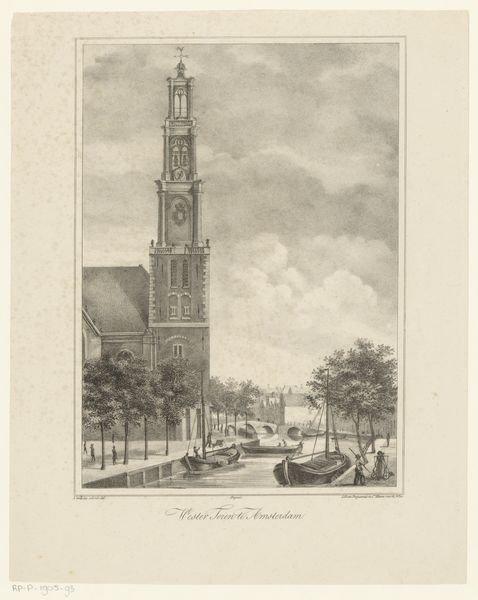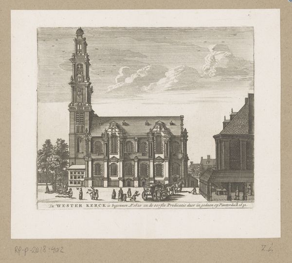 Editor: Here we have "Gezicht op de Westerkerk te Amsterdam," or "View of the Westerkerk in Amsterdam," an engraving from sometime between 1685 and 1726 by Daniël Stopendaal. It feels almost like a photograph in its detail, but one softened by time and the delicate lines of the engraving. What jumps out at you when you look at this? Curator: What strikes me first is the absolute stillness, doesn't it you? Look at the clouds hanging frozen in the sky, as if time itself has taken a pause. The Westerkerk looms there like a watchful giant, its reflection barely disturbing the canal’s glassy surface. The precision of the lines suggests an intention to capture not just the church, but also the serene mood of the city itself. Don’t you think that capturing light through the deliberate use of the engraving technique amplifies this quality of permanence? Editor: That's a great way to put it! It definitely makes me consider how prints preserve a single moment, especially from so long ago. I’m also intrigued by the people down by the canal; they look so small and peaceful against the grandness of the church. Curator: Yes, the people are tiny specks, aren't they? They serve, perhaps, as a measure of scale but also emphasize the dominating presence of the church, both literally and metaphorically. And that perspective – it seems meticulously crafted, leading your eye up towards the heavens via the church’s towering spire. Editor: It’s amazing to think someone, centuries ago, saw and captured Amsterdam in this way. Thanks for bringing those elements to light. Curator: And thank you for seeing with fresh eyes! Every viewing is, in a sense, a collaboration across time.