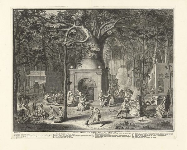 Editor: This is "Festende bønder (Maj og juni)," or "Peasant Holiday (May and June)", created by Sebald Beham in 1546. It’s a very detailed engraving. I find it almost overwhelming – there's just so much activity packed into this scene of celebrating peasants! What's your take? What's the story this piece seems to want to tell? Curator: It does burst with a sort of frenetic energy, doesn't it? For me, this image sings of the clash between idealization and reality. It presents this festive scene, supposedly representing May and June, but the style – almost obsessively detailed – seems to hint at the anxieties of the time. Do you see the hints of caricature in some of the figures? There's a subtle edge of satire cutting through the celebration. Editor: Satire, interesting! I hadn't quite picked up on that. I was focused on the sheer number of people and trying to imagine the sounds of the revelry. So you are suggesting there's a darker undercurrent. Curator: Perhaps not darker, exactly, but certainly more nuanced. Remember the Reformation was raging. Artists were exploring new ways to portray ordinary life. This engraving doesn't shy away from showing the pleasures of peasant life, but it frames it with, well, almost a self-conscious awareness. The artist asks: What does it mean to depict "common" folk? It's playful and observant, but there's a thoughtfulness woven throughout, like a little intellectual wink to the viewer. Editor: A thoughtful wink...I like that. It’s amazing how much you can read into an image like this once you start looking! Thanks, I have to confess my understanding went to another level with your commentary. Curator: That's the beauty of it! Art speaks, sometimes whispers, and always provokes thought if we allow it.