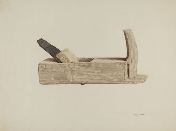Editor: Here we have Vera Van Voris’ "Wooden Plow," created around 1938, using watercolor and drawing techniques. The subject matter seems so…stark and simple. What do you see in this piece? Curator: Beyond its immediate representational value, this image serves as a potent symbol of labor and the agrarian roots of our society. Consider the historical context: the late 1930s, during the Great Depression and the Dust Bowl. How might this image speak to the suffering and resilience of rural communities? Editor: So, the plow is more than just a farm tool? Curator: Precisely. The artist asks us to reflect on the exploitation of land and labor, while also recognizing the profound connection between humanity and the earth. We could consider its symbolism within a larger dialogue of agrarian reform and social justice movements that sought to empower farmers and address the inequalities inherent in capitalist agricultural practices. What sort of dialogue can this art inspire in the viewers? Editor: It does make you think about where our food comes from, the people who work so hard, and how important it is to treat the land with respect. It feels very relevant to conversations we’re having today about sustainable agriculture and ethical consumption. Curator: Exactly. This simple wooden plow prompts essential questions. Does art reflect our societal values or shape them? Editor: That's a lot to consider about a seemingly simple painting of a plow! I see it in a new light. Curator: Indeed, art is never created in a vacuum, and interrogating the social forces intertwined within even the simplest of images reveals their lasting impact.