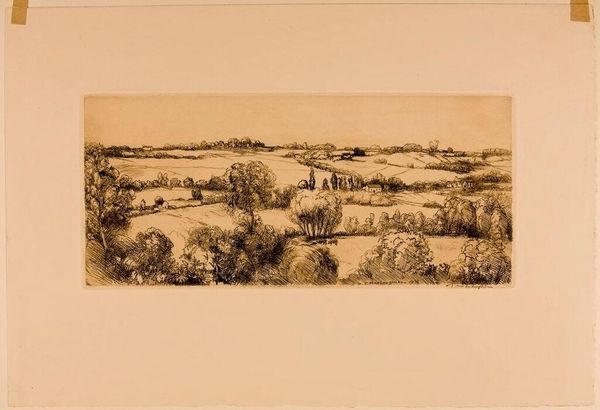 Editor: So this is "Augusteftermiddag ved Susaa", or "August Afternoon by Susaa", an etching by Axel Holm from 1895, currently residing at the SMK. It strikes me as a very subdued and quiet piece, with the hazy sky and still water. How do you interpret its historical context? Curator: This etching exemplifies the rise of landscape art as a reflection of national identity. Late 19th-century Denmark experienced a surge in artistic nationalism, seeking to define what it meant to be Danish through its landscapes. Holm's choice of the Susaa River, a relatively obscure location, rather than dramatic, romanticized vistas, might suggest a focus on the ordinary, the "everydayness" of Danish life, wouldn't you agree? How do you think that links to public perception? Editor: I can see that. So, was there an attempt to democratize art, making it relatable to a wider audience? Curator: Precisely. The etching, as a print medium, inherently lends itself to broader distribution compared to unique paintings. Consider how institutions like the SMK were evolving then, aiming to make art accessible. The intimate scale and tonal qualities of the etching also encourage a close, personal viewing experience. Do you see parallels to how photography also provided affordable visual documentation of the period? Editor: That’s a great point, I didn't think about that. It's like this etching captured the national spirit in a portable, reproducible format, accessible to more than just the elite. Curator: Yes. And don't forget, this idyllic scene also consciously ignores the socio-economic realities of the time: industrialization, urbanization and agricultural changes that actually altered these very landscapes. It's as much about what it includes as what it omits, presenting a carefully curated version of "Danishness." Editor: So it's both a reflection and a construction of identity. I never thought of it that way before! Curator: Art provides an interesting way to question popular ideas and culture. It is so much more than surface level.