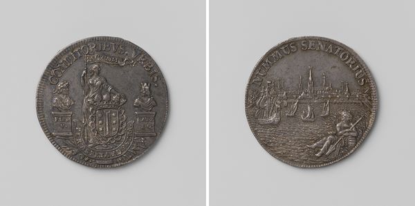 Editor: This is an engraved metal relief titled "Dantzig huldigt Johan Casimir van Polen," created in 1653 by Johann Höhn. It looks to be a coin or medal, and the detail packed into that small circular space is really impressive. What strikes you most about the way it's composed? Curator: The organization of space is compelling. Consider the division: One side depicts a detailed cityscape, presumably Dantzig, while the other presents a allegorical figure surrounded by symbolic objects. The visual contrast alone invites speculation. What is Höhn suggesting by positioning these elements in opposition, yet unified within the circular boundary? Editor: It’s almost like two different worlds or ideas, side by side. The allegorical figure, representing, perhaps, peace or prosperity, set against the very real city of Dantzig? Curator: Precisely. Examine the quality of line and texture. Notice how meticulously Höhn renders the architectural elements, juxtaposed with the flowing drapery and idealized form of the allegorical figure. This is the formal dance of line versus volume, realism against idealization. What effect does this visual rhythm create, do you think? Editor: It emphasizes the contrast. But it also makes you see both sides as equally important; there’s a balance in how detailed each is. The placement also draws my eye around and around in a circular motion...almost trapping it. Curator: Exactly! Höhn’s skillful control over visual elements creates a dynamic relationship, urging us to interpret their connection through form. Editor: I didn't consider the contrast of realism and idealization until now. So much meaning is packed into these choices! Curator: It illustrates that formal elements are far more than just decorative aspects of a work of art. It's a structural guide to deeper engagement and meaning.