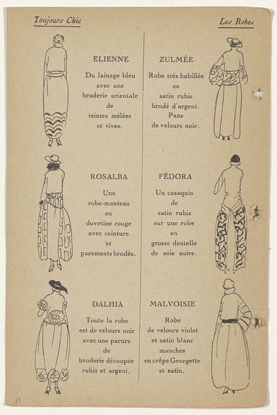 Editor: Here we have "Toujours Chic Hiver 1921-1922: index" by G-P. Joumard, a pen drawing from the Rijksmuseum. It strikes me as a really elegant, almost clinical display of fashion designs, like a blueprint for chic. What's your take? Curator: This fashion index provides insight into the societal forces shaping women's roles post-World War I. We see a departure from overtly decorative styles towards more streamlined silhouettes, reflecting a shift in social expectations and a growing sense of female independence. Joumard's work demonstrates how fashion was not just about clothing but also about articulating new identities. Notice how the descriptions highlight luxury materials, hinting at the exclusive clientele targeted by such designs. Does the somewhat muted presentation influence how you interpret it? Editor: Definitely. The subdued style sort of mutes the luxury, making it feel less frivolous somehow. It’s presented almost as an industrial design document. So, the clothes embody a move toward independence, but the presentation emphasizes industry, commerce and aspiration, all at once. Curator: Precisely. And consider where this would have been displayed – likely within fashion houses or journals catering to a specific socio-economic bracket. The accessibility of this imagery was limited, thereby enhancing the allure and exclusivity of the garments themselves. Does knowing this change how we view these designs now? Editor: It does. Thinking about it existing in a closed environment changes the dynamic. Now it feels less like simple aspiration, and more like carefully constructed desire, which you only get by belonging to an exclusive "in group". It all becomes incredibly intentional, when we consider it that way. Curator: It’s fascinating how understanding the socio-political landscape can reshape our understanding of what might initially appear as mere fashion sketches. Editor: Absolutely. I’m now much more aware of how these designs functioned within a larger, carefully constructed cultural system.