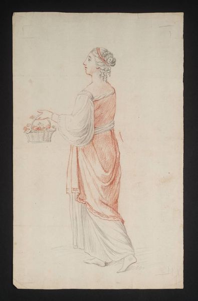 Editor: This delicate drawing from the Tate collection is by Prince Hoare. It shows a woman with a basket of flowers. It feels very classical, almost theatrical, in its presentation. What do you see in this piece? Curator: The scale and costume suggest this might be a study for a theatrical production, perhaps a pastoral drama popular in Hoare's time. Costume design played a huge role in conveying social status and moral character on stage; how might this woman's dress and pose communicate her role? Editor: I guess the loose gown and the flowers could imply innocence, or a connection to nature? I hadn't thought of the theatrical context. Curator: Exactly. And considering the politics of representation at the time, the artist’s choices can be interpreted as either reinforcing or challenging the existing social order. I find that fascinating. Editor: I agree. It changes how I see the drawing completely.
