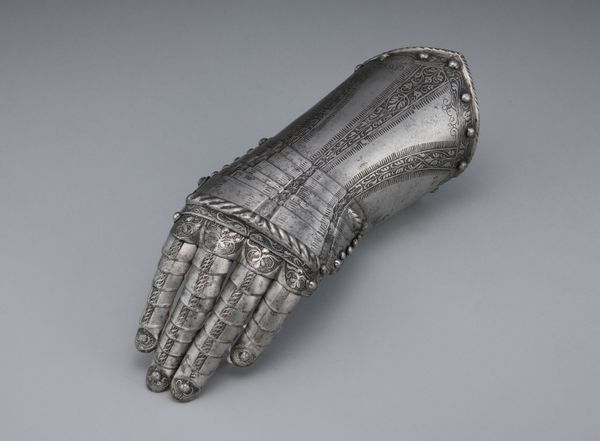 Curator: Looking at this photograph of the Mitten Gauntlet for the Left Hand, crafted around 1524 by Kolman Helmschmid, my immediate impression is one of layered strength. There's a compelling interplay of solid form and flexible construction here. Editor: Indeed. Armor production and function speak volumes about socio-economic stratification. A piece like this transcends mere protection; it embodies status, power, and the very real, tangible inequalities of the 16th century battlefield. Who had access to this? Who made it? Curator: Well, considering the maker was Kolman Helmschmid, the question of who made it is straightforward. I’m drawn to the precision and ingenuity of metalworking required to form and articulate it. Each plate overlaps, connected by rivets. It reveals a complex process of forging, hammering, and fitting. We see artistry married with pure utility. Editor: The details invite interrogation. Take, for instance, that raised rope design tracing along each plate. The time and skill needed suggest both pride and pressure, possibly coming from wealthy commissioners deeply invested in militaristic spectacle. How does its physicality echo ideas of embodied protection – both male and upper-class at that time? Curator: Exactly! We need to examine it materially and in context. This gauntlet would have been custom-made, implying a considerable investment of time and materials like steel. These details help connect the individual to the larger structures of power, class, gender roles, and conflict during that era. How effective was such armor? Were some metals favored, perhaps imported at great cost? Editor: Excellent questions. The craftsmanship would need to align seamlessly with its effectiveness on the field and during tournaments. This also demands questions about laborers mining raw material, as well as artisans and armorers specializing in gauntlets for combat. What can analyzing Helmschmid's works across contexts and careers teach us about guilds, international networks, and systems of production? Curator: That's where the value lies – digging deep into process! We could learn so much by reconstructing, step-by-step, the making of this singular artifact. Ultimately, it highlights how essential material culture is to the dynamics of historical class struggles. Editor: Right. It serves as a silent testament to global and class struggles embedded within artistic output throughout the ages. Reflecting on these artifacts urges us to contemplate those who were excluded. The hands this protected, and the millions this could decimate across medieval wars and conflicts.