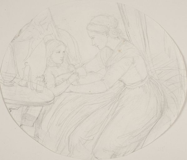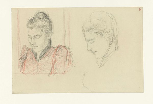 Curator: Here we have a compelling pencil drawing titled "Twee tegenover elkaar zittende vrouwen," or "Two Women Sitting Opposite Each Other" created sometime between 1834 and 1911 by Jozef Israëls. Editor: It has such a quiet, introspective feel. They both look so thoughtful, almost burdened. Curator: Israëls was known for capturing everyday life, particularly of those in the lower classes. Look at the intricate lines describing the women’s faces and clothing, suggesting the fashion of the time but also hinting at something deeper, perhaps hardship, or resignation. Editor: And their placement, facing each other, suggests conversation, or at least a relationship between them. One woman's head is slightly bowed, her finger to her lips, as though silencing herself. There seems to be an imbalance in the power dynamics shown here; it speaks volumes about how women had limited voice or power during this period. Their emotional labor seems palpable. Curator: The hand gestures are really powerful. You've got one propping her face, looking downwards, with the other woman doing much of the same gesture—mirroring yet separated by the gaze they hold. It echoes ancient representations of Melancholia, figures consumed by inner worlds and a grief connected not only to an emotion but as a bodily reality too. Editor: Exactly. The mirroring creates a closed-off emotional space that seems typical to so many depictions of women during this time. How often are their lives—the reality of the female experience—reflected in the dominant art discourse? Curator: That is precisely what makes this such a powerful representation of not only individual portraiture but its historical positioning—Israëls captures the psychological space these women may be occupying. Editor: Yes. It invites a reconsideration of those histories and legacies. It holds their place there. Curator: In short, there's such a vulnerability and grace present in such minimal sketching—the work allows for layers of reading beyond the immediate appearance. Editor: A silent, powerful narrative embedded within those sketched pencil lines.
