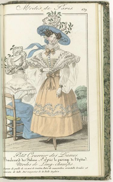 This fashion plate, titled "Petit Courrier des Dames, 1829, No. 623," was printed in Paris, and captures the sartorial sensibilities of the time. Though created by an anonymous artist, its existence speaks volumes about the cultural emphasis on fashion and femininity in 19th-century France. Here we see not just clothing, but a carefully constructed image of an ideal woman. Her dress, with its emphasized waist and voluminous sleeves, speaks to the era’s restrictive yet ornamental vision of womanhood. This vision emphasizes delicacy and domesticity. The bonnet, adorned with ribbons and lace, frames her face, drawing attention to her perceived beauty. What's unsaid, but crucial, is who gets to partake in this world of beauty. These fashions would have been exclusively available to the upper classes, highlighting the social and economic divides of the time. So, while the print invites viewers into a world of elegance, it simultaneously reinforces the boundaries of class and privilege.