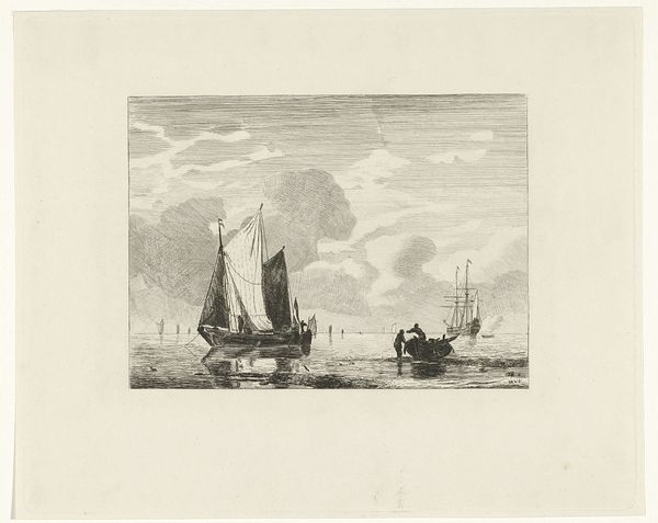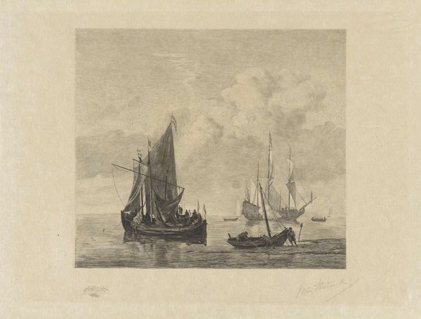 Editor: Here we have Piet Verhaert’s "Schepen liggen voor anker bij een rede," an etching on paper created in 1887. It’s quite a detailed image of ships at anchor, with a very serene, almost hazy quality. How would you interpret the composition and style choices in this piece? Curator: Focusing purely on its visual elements, the composition utilizes a subtle tonal range, primarily achieved through intricate line work. Notice how Verhaert creates depth through variations in line density, especially in rendering the sky and the surface of the water. Observe also how the size and placement of the ships lead your eye through the artwork, providing a rhythm to the scenery. Editor: It's interesting you point that out; I was initially drawn to the subject matter, but now I see how skillfully he uses line. What is your sense of the influence of Impressionism in it? Curator: The label of "Impressionism" here is more loosely applied, I think. While Verhaert certainly captures a transient moment – light reflecting off the water, a hazy atmosphere – the emphasis remains on representational accuracy and clarity of form, rather than dissolving forms into pure light and color, as one might expect from Monet. The detailed rendering and emphasis on line point to a more Realist grounding. Do you see the same? Editor: Yes, now that you point that out. I had seen the tag, and was projecting a different set of expectations onto the image. Curator: Exactly, sometimes the act of naming a style influences the interpretation. The effectiveness here truly lies in the intricate balance between precise depiction and evocative atmosphere. Editor: It’s helped me to look beyond the subject matter and to appreciate how Verhaert orchestrates these visual elements. Thank you! Curator: My pleasure. This close looking helps illuminate how the intrinsic visual features achieve certain aesthetic effects.