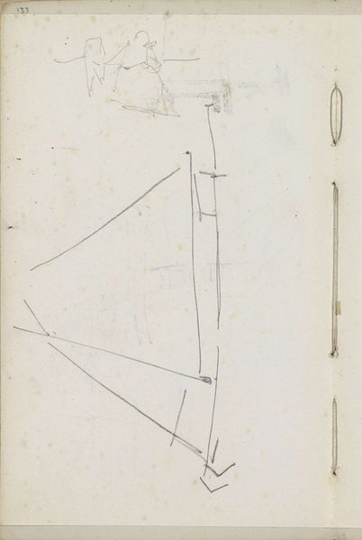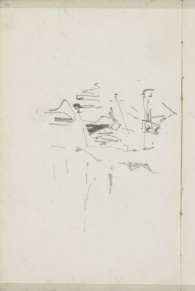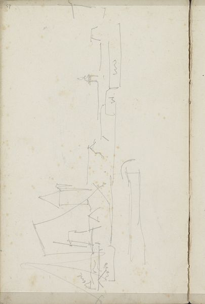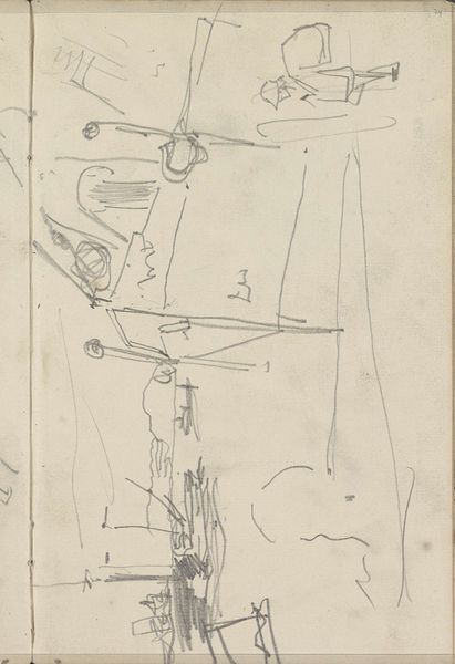 Curator: Before us is George Hendrik Breitner's piece from around 1880 to 1882, titled "Studies". It’s currently housed here at the Rijksmuseum. Editor: My first thought is sparseness, a visual austerity. These are incredibly delicate lines; they feel like fleeting thoughts captured on paper. What’s immediately striking to you about this drawing? Curator: The dynamism of the linework captures my attention. Observe how Breitner utilizes both controlled precision and impulsive, almost erratic marks. There is an interplay of structural elements suggestive of space without definitive enclosure. The work exemplifies minimalist strokes in drawing practice. Editor: I see the ghost of architecture – remnants of scaffolding and support. I wonder, what did these stark forms symbolize to Breitner? This minimalist approach is interesting given the industrial revolution in Europe at the time and its cultural memory relating to modernization of society, Curator: From a formal perspective, Breitner employs line to construct a visual puzzle; the arrangement avoids conventional perspective. Editor: Do you feel this aesthetic choice creates space for varied interpretations based on experience or even societal roles. It may relate to class and perspective for people living at that time. Curator: Undoubtedly, one finds that its accessibility is enhanced. Yet there's a purposeful ambiguity to it, inviting exploration beyond easy comprehension, but how about you; what is it about this artwork that stays with you now? Editor: For me, this artwork triggers thought around a construction phase of a city, perhaps, and that process can stand as a visual metaphor for the constant reinvention present within us as well. Curator: I would say that, analyzing these sparse marks, it illustrates how suggestion itself can define an aesthetic encounter. Editor: Indeed. Breitner uses suggestion so powerfully that even decades on, it retains impact with an economical vocabulary of visual cues.