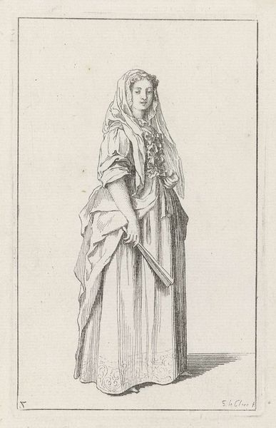 Editor: This is "Dame met fontange, open waaier in de hand, naar links," or "Lady with Fontange, Open Fan in Hand, Facing Left," an engraving by Sébastien Leclerc I, dating back to the early 18th century. The level of detail achieved with just lines is really remarkable. What catches your eye? Curator: Oh, where does one begin with such a confection of the Baroque period! Beyond the craftsmanship, it sings to me of coded messages, don’t you think? The fan, the pose... it's a theatrical language of longing and availability, or perhaps the opposite! Consider her *fontange,* a towering, be-ribboned headdress, a marvel of engineering and social signaling! What’s your feeling on it? Editor: That’s interesting...I hadn't thought about coded language. I mainly just saw the fashion. The headdress does seem…unstable! Like it could topple over at any moment. I suppose, knowing that these fashions were for the elite does change things, though. What does the fan tell us? Curator: Exactly! That fragility is part of its charm, the ultimate precarious balancing act to signal social power. The fan...Ah! A whole vocabulary resides in how it's held, how open, what is concealed, and what's revealed! Think of it as proto-emoji in fabric and bone. What sort of mood would you ascribe? Coquettish, coy, a touch bored maybe? Editor: Maybe a bit of bored elegance. This piece really makes me want to read more about 18th-century fashion and social etiquette. Thanks for sharing your perspective! Curator: My pleasure! It’s amazing how a little bit of focused looking can open up these historical doors. Each line tells a story if you only take a breath to see it!