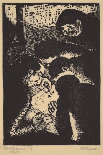 Editor: This is Fayga Ostrower’s "Fontamara IX," a print made in 1947. The stark contrast between the blacks and whites creates a feeling of both intimacy and starkness, like witnessing a very private moment in public. What do you see in this piece? Curator: The power of "Fontamara IX" lies in Ostrower's ability to weave together the personal and political. Look at how the figures huddle together; consider the narrative implications in light of 1947. Can you see how the figures almost melt into one another in the inky blackness, set against that landscape? Editor: I do. It's like the environment itself is pressing in on them. So, is this referencing a specific political context, or more generally about displacement? Curator: That feeling is key. Remember that Ostrower, a Jewish émigré from Poland, arrived in Brazil just before WWII. "Fontamara" speaks to collective identity and the search for refuge in the face of unimaginable adversity. It's not just displacement; it’s about building community amidst shared trauma. Editor: That's powerful. So, the intimate setting isn’t just a snapshot of life, but a symbol of resilience. I'm now also considering the idea of collective trauma and how that plays out here. Curator: Exactly. The limited tonal range emphasizes the severity of their reality. Think about the historical moment and the power of simple graphic language to convey profound meaning. The choice of printmaking itself, a medium capable of mass production, suggests the potential for widespread dissemination of their story. Editor: That gives me a completely different appreciation for the work. I came in seeing a simple composition but now I see this work as a testament to the power of community. Thank you! Curator: Indeed. Ostrower pushes us to contemplate the enduring impact of conflict on our shared humanity.