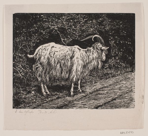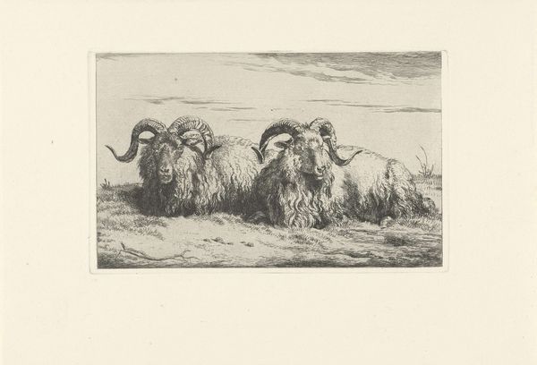 Curator: Here at the Rijksmuseum, we have Jacoba de Graaff's print "Schapen in een stal," which roughly translates to "Sheep in a Stable," believed to have been created between 1867 and 1911. De Graaff was known for her work in genre-painting and landscapes. The media listed are varied; etching, engraving and print. What are your first thoughts on seeing it? Editor: Immediately, there's this enveloping sense of quiet. It’s like stepping into a hush. The sheep, huddled together, feel incredibly vulnerable, as if sharing secrets in a space away from the noise. Is that gloom, or intimacy that the artist has captured so subtly in the limited light? Curator: That's interesting. Considering its place within the genre painting tradition, and also realist aesthetics, one could suggest the work hints at broader anxieties about industrialization and urbanization encroaching on traditional agrarian life, anxieties acutely felt and negotiated by women in particular, whose lives were intimately tied to that very transformation in that time. Editor: You know, now that you mention it, there's also a slightly melancholic air. I almost want to touch the wool. As a medium, it being a print on paper can feel, visually, as real as wool through the ink, and etched texture. This sense that their quiet space is also one of entrapment; these creatures, even as part of their existence, are commodities, so to speak, under this roof of the stable. I sense that she gives each its own personality and place in its social strata. Curator: It's a space where the animals exist, undeniably, within the control and perspective of humans. And what’s potent about De Graff’s image here, if you consider gender dynamics, is her focus on representing a subject—rural labor—from a vantage point so often not allowed at the time: a woman artist looking at animal husbandry, with perhaps the understanding that she too has that relationship to patriarchy at the time. Editor: Looking at it again now, after what we’ve talked about, changes its tune for me. I find myself looking closely at that small lamb on the left; nestled. It's so quietly subversive. Thank you. Curator: Absolutely. There are multiple angles to approach with Jacoba's art.