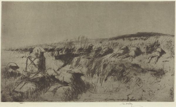 James McBey made this etching, The Sniper, No.2, with lines that create an image out of something that could have just been chaos; it’s a reminder that artmaking is all about finding order in the mess, right? Look at how McBey uses the etching needle to mimic the wild grasses, a furious thicket rendered with such a delicate touch. Those marks aren't just describing what's there, they’re building this world, a place where tension hangs in the air. The sniper’s helmet is barely visible. He’s not separate from the landscape, but totally embedded in it. The scratches and scribbles of the etching process emphasize this sense of concealment. You might look at someone like Käthe Kollwitz, who also used etching to convey something about war, in her case the impact of conflict upon ordinary people. Art isn’t about having all the answers but asking the right questions. This work leaves you pondering the human condition and the ambiguities of war.