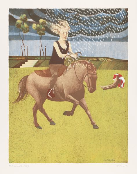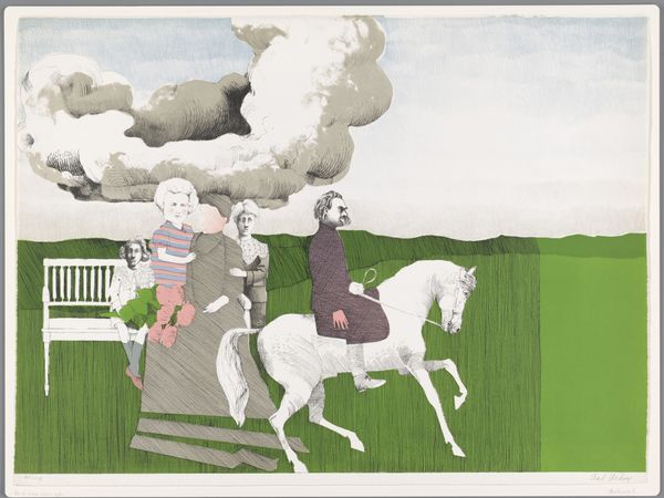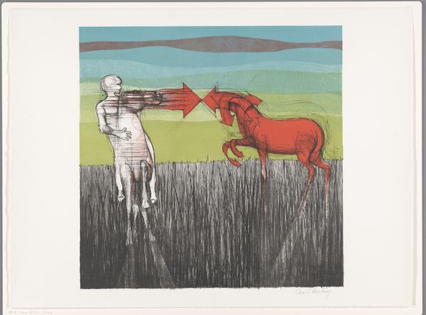 Editor: This is Harrie A. Gerritz’s "Wild Horses," created in 1978. It seems to be an acrylic print. The stark geometric shapes create such a distinctive, almost unsettling landscape. What jumps out at you when you look at it? Curator: Immediately, I see a commentary on the relationship between human intervention and the natural world. The domesticated horse in the foreground is separated, almost isolated, from the wild herd in the distance by these striking blocks of color. The artist’s simplification, almost to the point of near abstraction, makes me think about the visual language of modernism. Does this sanitization of nature also hint at a distancing, a controlling impulse within contemporary society's view of nature? Editor: That’s a fascinating idea! I hadn't considered the aspect of control, but it makes perfect sense. I was more focused on the purely visual—the flattened perspective and bold colors feel so contemporary. Do you think the choice of a mundane subject, like a horse, contributes to this? Curator: I think it absolutely does. Horses were central to Dutch rural life for centuries, but were increasingly supplanted by machines in the 20th century. So, to present this subject through a Modernist lens suggests both an idealization and an obsolescence. The print becomes a kind of socio-historical artifact. Editor: So the painting doesn’t just depict horses, but tells a larger story about societal change? Curator: Exactly. And don't overlook how institutions play a role here. This artwork is in the Rijksmuseum; isn't it fascinating how this modernist perspective on rural life now becomes a part of national heritage, a consciously crafted visual narrative? Editor: Wow, I am not going to look at rural landscapes the same way again! Thank you, that was a very helpful dive into art history and societal changes. Curator: My pleasure. Thinking about how artistic style, social shifts, and even museum collections interrelate enriches our experience.