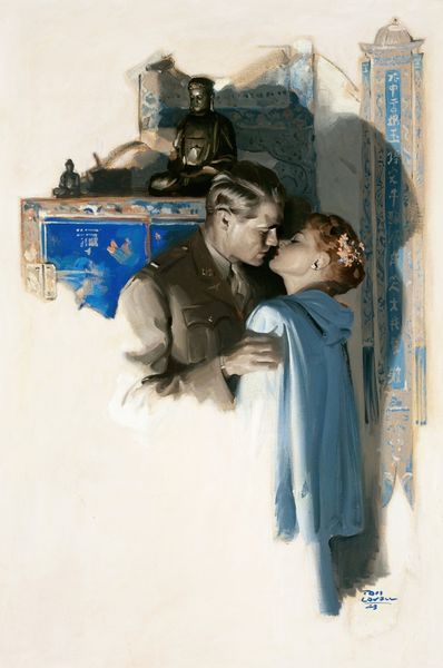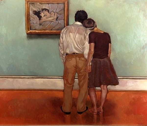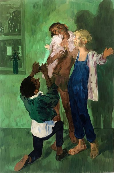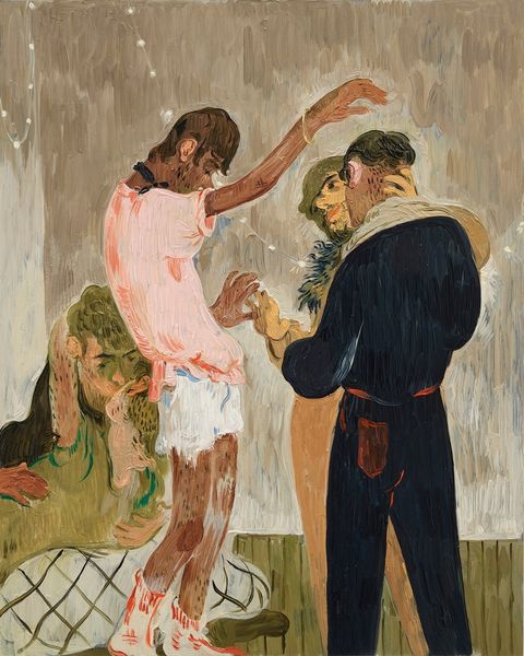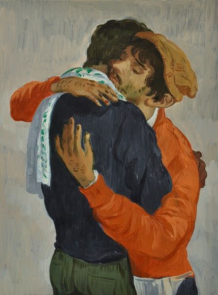 Editor: This is Salman Toor’s "The Confession" from 2019, an oil painting that’s both intimate and melancholic. The subdued lighting and the figures' body language make it feel like a stolen moment. What strikes you most about it? Curator: It’s fascinating how Toor situates personal narratives within a larger socio-political framework. The setting feels intentionally ambiguous – is it a domestic space, a liminal zone? – which heightens the sense of vulnerability in what appears to be an intimate exchange. Who has the power in this dynamic, and how do the formal elements emphasize that? Editor: I hadn't considered power dynamics. Is that something you see reflected in the almost theatrical lighting, spotlighting the older man? Curator: Precisely. Consider how museums and galleries shape public perceptions of these encounters. The act of confession implies judgment, and Toor is deliberately implicating the viewer, us, within this circuit. How does the artist confront issues of representation, given the lack of characters of colour in Western Art? Editor: The bare feet and casual clothing feel like a deliberate subversion of traditional power structures. And placing it against the backdrop of art history brings another layer to its meaning! I definitely have a different interpretation after hearing you break it down! Curator: That's the beauty of viewing art through a socio-political lens; it prompts us to question not just what we see, but also why we see it in a certain way. The painting provides commentary on the socio-economic setting, adding profound depth to what initially appears to be an ordinary confession between people.