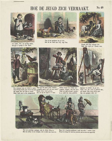 This undated print by De Ruyter & Meijer, titled "Verschillende taferelen," presents a series of vignettes rendered with delicate lines and soft coloring. The composition, arranged as a grid, invites our eyes to wander across scenes of daily life, imbuing a sense of narrative and social commentary. Each tableau, framed by its own border, functions as a semiotic unit. These scenes offer a glimpse into the values and structures of its time. For instance, the image of children at school contrasts with scenes of leisure, highlighting the social dynamics of education and play. The print destabilizes a fixed meaning, encouraging the viewer to construct their narrative by navigating the arrangement of scenes. Ultimately, the formal arrangement reflects a broader cultural discourse, prompting reflection on how we interpret the interplay between individual scenes and collective meanings.