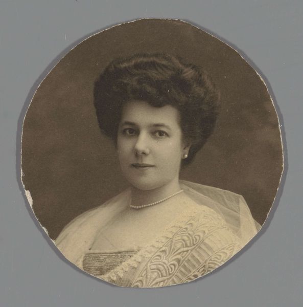 This small photograph on cardboard of Queen Wilhelmina was created by Herman Deutmann. The muted sepia tones give the portrait a soft, almost dreamlike quality. The composition is formal, focusing on her bust, adorned with pearls and a feathered stole. Consider how the artist uses these elements to convey the status and personality of the queen. The pearls, meticulously rendered, serve as signifiers of wealth and status. More subtly, the soft focus and muted tones perhaps suggest a romanticised view, imbuing her with an almost ethereal presence. This image, while seemingly straightforward, raises interesting questions about representation and power. How do such carefully constructed images shape our perceptions of historical figures? It's through these visual clues, these calculated arrangements of light and form, that the artist engages in a dialogue about image construction.