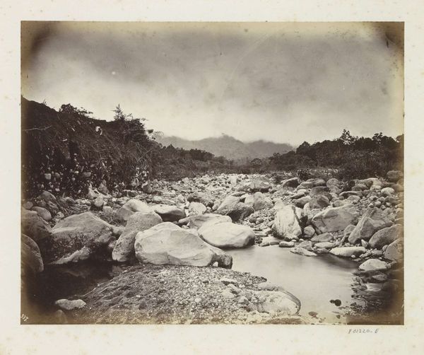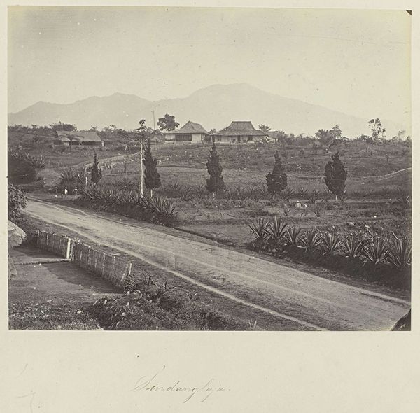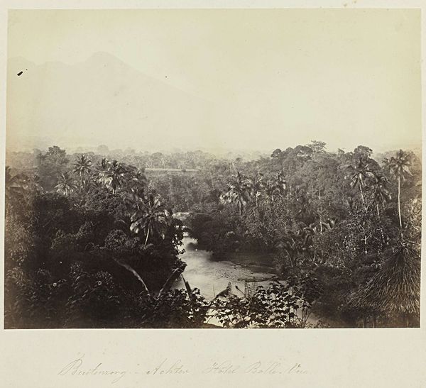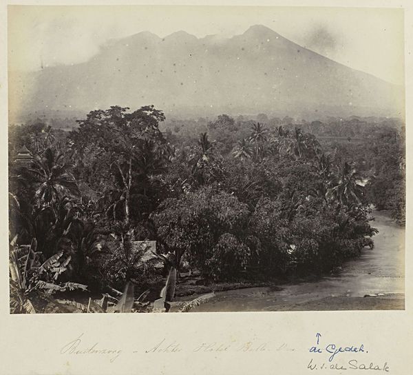 Curator: Woodbury and Page's gelatin silver print, "Rijstvelden bij Batoe Toelis - Buitenzorg," taken sometime between 1863 and 1869, offers a sweeping view. What's your immediate reaction to this Indonesian landscape? Editor: I'm struck by the sheer scale of the image, and its somber mood. The imposing mountain in the background looms over what looks like perfectly geometric rice paddies. It presents a sense of order imposed onto a wild, untamed landscape. Curator: Yes, the composition is very carefully constructed. The lines of the rice paddies in the foreground create a strong horizontal base, leading the eye toward the dense forest and then up to the mountain peak. Note how the varying tones of gray—the effect of the gelatin silver process, perhaps—create depth. Editor: The mountain evokes feelings of strength and permanence, certainly. Mountains are so often imbued with symbolic weight; they often represent wisdom or obstacles. The rice paddies, laid out with their rigid lines, almost become a battle against nature—a subjugation of the landscape. Curator: The cultural context is key. This work emerges from a period of increased Western presence in Southeast Asia, fitting within the artistic frame of Orientalism. Note how it depicts a somewhat exoticized, yet ordered scene, for consumption by a Western audience. The detailed recording of the rice fields, that crucial source of nourishment, are presented almost as specimens. Editor: Indeed. But I find that my eye is drawn to the vegetation. The specific tree forms, some rather elegant palms, almost serve to indicate this landscape as specifically exotic. Their prominence speaks to nature's raw vitality. They stand out in ways that other objects do not. Curator: I see your point about that single, prominent palm. Formally, it breaks up the geometric progression, adding visual complexity and stopping it from becoming simply representational. It punctuates the image with verticality, disrupting any simple reading of an idealized Orientalist tableau. Editor: Thinking about the way these photographers depicted this landscape, I am struck how images help shape perceptions. Curator: Absolutely. In its detail, the print's formal tension resides in its ability to communicate both information and a symbolic framing of this cultural encounter.