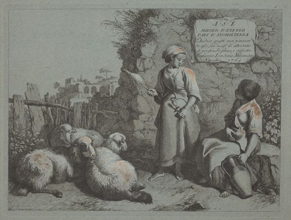 Editor: Here we have Francesco Londonio’s "Sleeping Peasant and Standing Spinner" from 1763, an etching that captures a seemingly ordinary rural scene. What strikes me is how staged it feels, almost like a pastoral play frozen in time. What do you make of this image? Curator: You’ve hit on something interesting there. Genre paintings like this weren’t simply reflections of reality; they were actively constructing ideas about rural life, about "the peasant". How does Londonio want us to *imagine* rurality, and *for whom*? It is pastoral, but what sociopolitical narratives do you believe it supports? Editor: Hmm, it feels a bit romanticized, maybe even naive. The peasant sleeping peacefully, the spinner dutifully working…It doesn't show the hardships. It feels a bit like propaganda, reinforcing existing power structures perhaps? Curator: Exactly. This image isn’t neutral; it's working within a very specific historical and political context. The elites often controlled narratives about the lower classes, presenting them either as noble or as inherently needing guidance. How might this representation, which avoids displaying physical hardship, influence how people of the time viewed those outside their own social class? Editor: I guess it creates a distance, a sense that the wealthy are viewing an idealized performance of peasant life, rather than understanding real people. Curator: Precisely! By looking at how social classes are portrayed and what those representations *do*, we can uncover so much about the power dynamics of the era. It goes beyond appreciating the artistic style; we see art actively shaping social perceptions. Editor: That makes a lot of sense. I initially saw a quaint scene, but now I realize there's a whole political landscape embedded within the image itself. Curator: Absolutely! The public role of art extends to actively reinforcing and sometimes challenging political ideas. This artwork and others remind us to consider that art is more than merely aesthetics or the beautiful rendering of things; it can be involved in cultural debates about social justice.