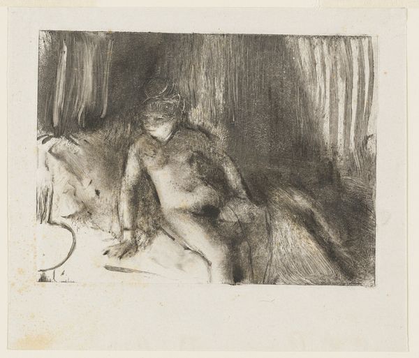 Editor: This etching, "Misery," by Paul-Albert Besnard from 1886, strikes me as quite bleak. The textures created by the etching process really amplify the stark atmosphere. What's your take on this piece? Curator: As a materialist, I see this work as a product of its time and the social conditions of artistic production. Consider the availability and cost of etching materials in 1886. This influenced Besnard's artistic choices. Also, note the intense labor required for the etching process. Does the chosen medium inform your understanding of the artwork’s supposed “misery”? Editor: That's a compelling perspective. I hadn't considered the labour aspect influencing my interpretation of the "misery." The cross-hatching creates shadows, adding to the oppressive atmosphere, but is that just aesthetic, or something more? Curator: Perhaps the dense network of lines reflects the material conditions of production. Besnard painstakingly layering ink lines onto the plate – almost mimicking the weight and burden of suffering through labor. Editor: So you're suggesting the technique *itself* conveys the "Misery," not just the depicted scene? It makes me think about the social role of prints—were they accessible images made for mass consumption, or were they luxury goods for wealthy collectors? Curator: Exactly! Think about how the consumption of art further entrenches its meaning. A print, potentially accessible to a wider audience, circulates this image of misery, prompting societal reflection or perhaps… detachment? What do you think Besnard intended for its consumers? Editor: I guess I was stuck on a symbolic, individual level. Now I'm considering the labor, the social context of production and consumption. Thanks, this gives me a new way of viewing prints! Curator: And I was reminded to appreciate the visceral impact of Besnard's composition. A fruitful exchange.