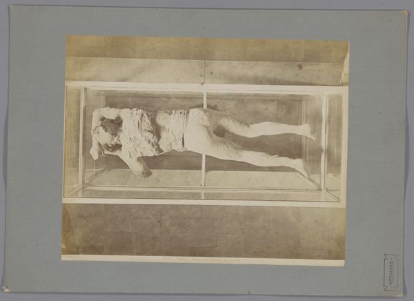 Curator: There’s something unsettling, almost eerie, about this piece. The dreamlike quality hangs so heavily. Editor: Well, let's set the stage a bit. We're looking at a gelatin silver print, a photo reproduction dating from about 1865 to 1900. It replicates an earlier image – a print after Francesco Albani's depiction of the Christ child asleep on the cross. It really highlights the complex dance of production, copying, and circulation in the art world. Curator: I see what you mean, but all I can see at first glance is just how incredibly fragile it looks. That small child sleeping so innocently on, well, an instrument of death! It is very disturbing, as if his destiny is predetermined... And the soft, faded landscape is like the backdrop for a fable, an old, dark fairytale. Editor: It's interesting you bring up fragility, because it extends to the very material of the print itself, wouldn't you agree? The gelatin silver process was pretty commonplace, mass-produced; this isn't some rare, hand-painted masterpiece, it’s more like visual merchandise that puts the suffering of Jesus, his labour as a figure for others, at center stage. Curator: So true! But to focus solely on that misses something crucial. Notice the child's serenity as if untouched by any worry or any sin? He's oblivious and that blindness lends a peculiar sweetness to the somber premonition. What about Albani's take? Is it an attempt to reconcile purity with suffering? To find the "holy" in mundane photographic methods? Editor: Perhaps. What strikes me is how the artistic skill that crafts images of devotion often relies on networks of workshops, cheap labour and commercial strategies of selling copies that ultimately makes them precious relics of our collective need for visual symbols. So while the landscape behind hints at transcendence, it also implies commerce that ultimately transforms what’s being circulated. Curator: Indeed. Though even aware of that, even *because* of that, the paradox remains powerful, like gazing at a shadow cast by faith and technology hand-in-hand! So unsettling. Editor: I agree. Its unsettling impact reveals a deeper examination on materials, artistry and meaning within these objects. And it is a useful reminder that every print comes from materials extracted somewhere, assembled by someone.