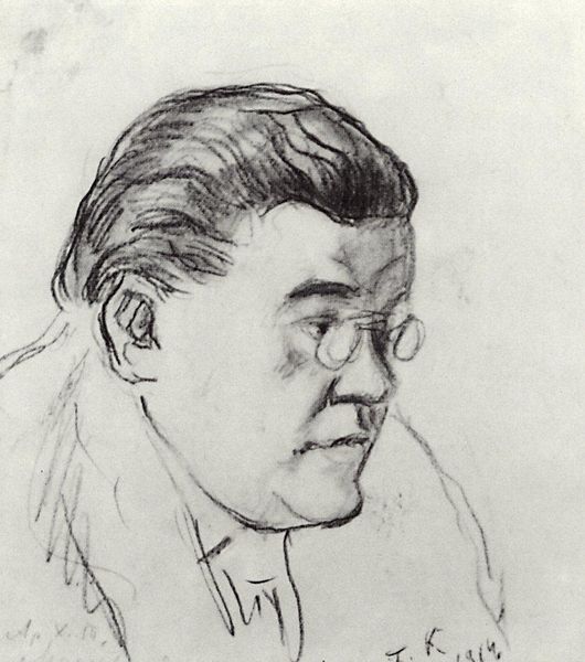 Boris Kustodiev drew this portrait of V. Luzhsky in 1915, and you can tell it was likely created with charcoal or graphite, maybe even a conté crayon, just by the way the lines move across the paper. I love how economical the marks are, Kustodiev is using the bare minimum to conjure up an entire person. The texture is pretty smooth, I mean, it’s a drawing on paper, but the shading is where it gets interesting. Notice how he uses these quick, almost scribbled lines to build up the shadows? It's not about perfection; it's about getting the essence of the person down. Look at the area around the eye sockets, how Kustodiev just goes to town with the shading. It gives Luzhsky this intense, almost melancholic look, and those glasses? They just add to the mystery. For me, it recalls the drawings of Käthe Kollwitz, a similar emotional intensity and directness. But, you know, art’s all about conversations, artists riffing off each other, and sometimes, it’s the questions, not the answers, that really get you thinking.