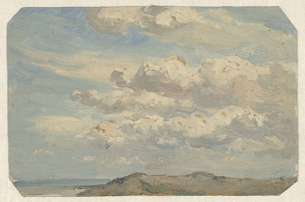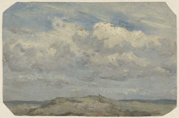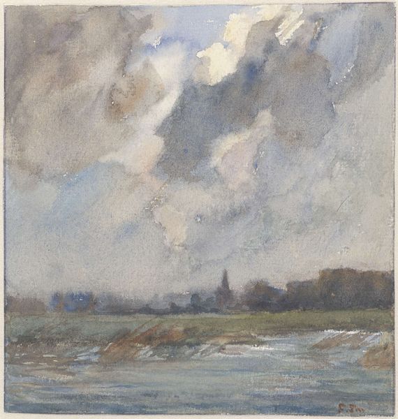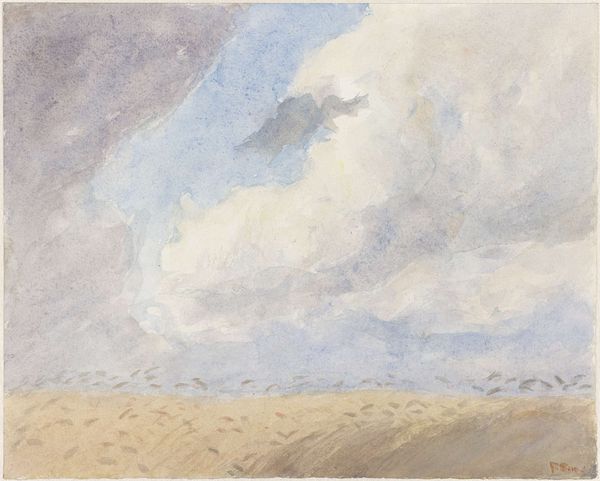 Curator: This watercolor, entitled "Duinlandschap bij storm" was created by Frans Smissaert between 1872 and 1944, and is held here at the Rijksmuseum. Editor: My initial response is a feeling of both vastness and vulnerability. The wide expanse of sky dominates the composition, and the lone figure on the horizon line feels incredibly small. There's an undeniable tension, I think. Curator: Absolutely. It’s a potent distillation of Romantic ideals regarding nature. What is especially interesting here is that this artist painted it “en plein air,” as indicated by gallery archives, really capturing the direct atmospheric conditions as they unfold around him. He seems driven by capturing light effects and an immediacy of place. Editor: That really reinforces my reading. Painting outdoors in that landscape during a storm demands resilience. This isolated individual becomes an avatar for us all as it stands before nature's overpowering forces. Watercolors really amplify that sentiment—transparent, shifting like the sky itself. Curator: Yes, watercolor was certainly employed at that moment in art history to demonstrate new perceptions, with subjects such as landscape that previously may not have garnered as much respect beginning to express shifting public views on nature. Editor: I also read a lot into the symbols related to water here. On one hand water represents purification, cleansing—yet these storm clouds can very easily indicate chaos and potential destruction. Seeing the artist's vision this way really gives the subject profound spiritual weight! Curator: Certainly. We must also consider Dutch landscape painting’s deep roots. This wasn’t simply observational painting but an act of asserting Dutch territory. Such works were crucial in nation-building and civic pride; even seemingly humble watercolors were part of a broader visual culture shaping identity and reinforcing shared landscapes. Editor: It's really remarkable how even with such delicate application, we see this weight of history, collective memory channeled through landscape as powerful visual allegory. I had never thought to consider storm imagery and ideas of nationhood side by side like this! Curator: Well, it showcases art’s ongoing influence. From the personal response evoked by weather, to its ties to public ideologies surrounding the construction of nationality and environment. Editor: Indeed—it prompts introspection not just on one's internal world facing larger struggles but also collective views surrounding environmental engagement, both now and through history!