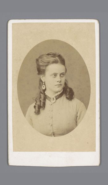 Editor: So this is a photograph by Christian Theodor Kirch, titled 'Portrait of an Unknown Young Woman,' likely taken between 1875 and 1881. It’s a gelatin-silver print. The oval framing feels quite intimate to me. What catches your eye? Curator: Consider the material reality of this photograph: a gelatin-silver print. This process, developed in the 1870s, democratized photography. How does the increased accessibility of image-making affect portraiture at the time? We’re seeing a shift. It's not only the elite who can afford to have their likeness captured. The print suggests a burgeoning middle class with new access to this form of self-representation and social display. Who do you think the artist aimed for in this market? Editor: I hadn’t thought about it that way, focusing on access and consumption! Maybe it shows this 'realism' tag in more than just the aesthetic – perhaps in the societal change the tech allowed for? Do you think the relative cheapness changes what people ask of it compared to painted portraiture? Curator: Absolutely. It's not just about replicating reality. Photography provided a new way of understanding the self within a rapidly industrializing society, even if this process remained embedded in a socio-economic network of labor, equipment, and studio practice that made photographic portraits possible. I find it useful to understand the entire mechanism of the trade to learn about social change and cultural values. What impact do you imagine cheaper portraits had on how folks remember the dead or keep in contact across large distances? Editor: That brings the "realism" in photography into much sharper focus for me. The material underpins societal factors. Thank you! Curator: A fascinating reflection indeed.