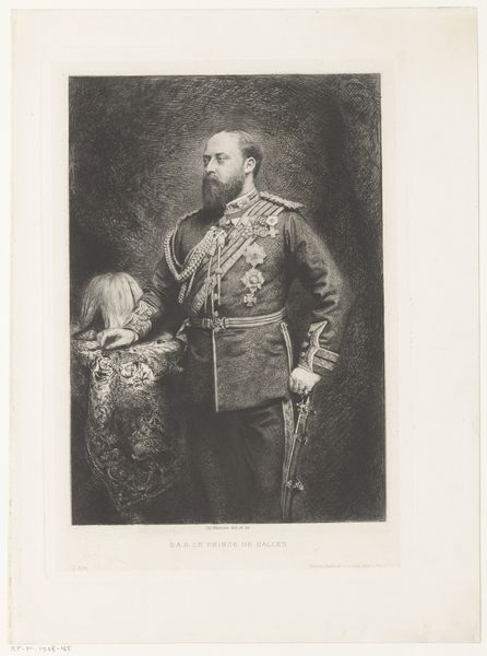 This is Johann Wilhelm Kaiser's portrait of King Willem III, rendered with meticulous detail through lithography. The portrait presents a study in contrasts and subtle gradations. The use of lithography allows for a play of light and shadow, where the king's figure emerges from a soft, hazy background of landscape and sky. The composition centres on the figure, whose gaze directs our own, while the background elements add depth without distracting from the main subject. The textures achieved through lithographic techniques, particularly in the rendering of clothing and facial features, create a tactile quality that invites closer inspection. Consider how Kaiser uses the monochromatic palette to focus our attention on form and structure. The absence of colour encourages us to engage with the subtle tonal variations and linear precision that define the portrait. This piece reflects a broader artistic concern with realism, yet it transcends mere representation by engaging with the expressive potential inherent in the lithographic medium itself. The portrait invites ongoing interpretation as a historical document.