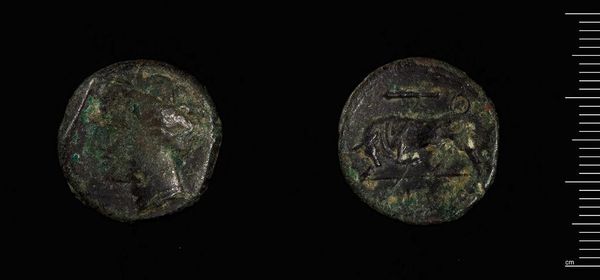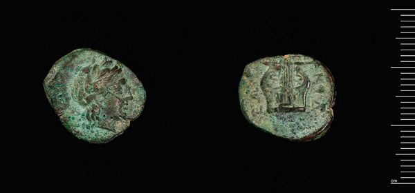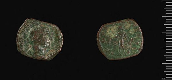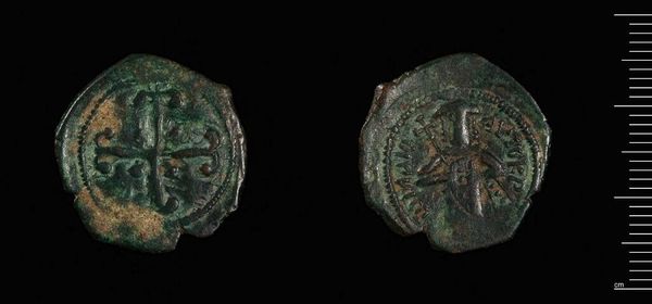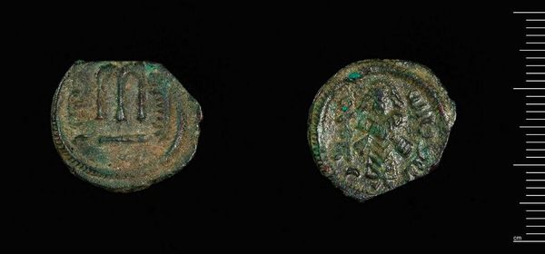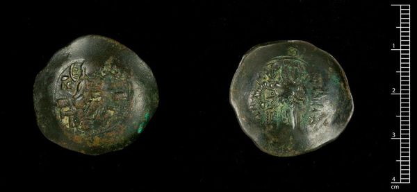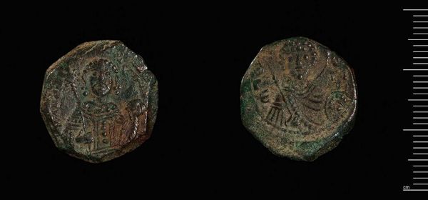 Curator: Here we have a Copper Tetarteron of John III Vatatzes, from Magnesia ad Meandron. Editor: The coin’s weathered surface speaks volumes. Its green patina tells a story of age and wear, doesn't it? Curator: Indeed. Its design elements, while worn, suggest a hierarchical composition, likely symbolic of power dynamics. Note the arrangement of figures and symbolic objects. Editor: I'm struck by the process of its creation, the repetitive striking, and the widespread circulation. It connects us to the economic realities of the Byzantine empire. Curator: Its semiotic weight is undeniable. The figures and symbols can be decoded for their intended meaning, especially in relation to the emperor's reign. Editor: And what about the miners, the smiths, and the merchants, all linked by this humble coin? Curator: A compelling point. It seems we both find different, yet equally valid, avenues into appreciating the coin's profound nature. Editor: Absolutely. It's a tangible link to labor, trade and society.