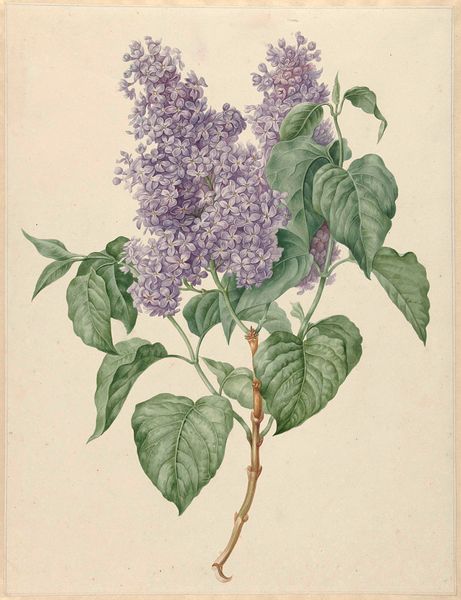 Curator: I find "A Bouquet of Flowers with Insects" utterly charming! It feels like stepping into a secret garden, a world observed through the most romantic of lenses. Editor: At first glance, the composition feels slightly imbalanced, an asymmetry between the weight of the upper floral elements and the heavier, denser forms below. The artist here is Pierre Joseph Redouté, noted for his botanical drawings in watercolor medium. Curator: Imbalanced? I think it's utterly perfect. The lilac at the top almost feels like a cloud, lending airiness. And below, that burst of darker purples and the grounded leaves create such drama! Don’t you feel how Redouté plays with that sense of fleeting beauty? Editor: There's a distinct interplay of form, yes. Notice how the vertical stems act as organizing principles, guiding the eye through the somewhat chaotic profusion of the petals. Redouté uses line to create these vectors within the essentially Romantic sensibility. Curator: And see how even those little insects contribute—a dancing orange butterfly there, adding such unexpected joy and reminding me that everything fades… a bittersweet reminder, a gentle melancholy. Editor: Observe, too, the rendering of light. The watercolor medium lends itself to capturing a transient moment. Redouté leverages the semi-transparency to simulate light filtering through petals and leaves, evoking ephemeral beauty through structural detail. It reminds us of art’s role in attempting to freeze those very fleeting moments. Curator: Absolutely! The little nuances and details remind me how art and nature mirror each other in this endless dance. A gorgeous reminder to find beauty in every imperfect thing. Editor: Indeed. "A Bouquet of Flowers with Insects" offers, therefore, a complex study in contrasts: permanence against ephemerality, structure balanced with the irregularity of nature itself, creating a unique and subtly intellectual aesthetic experience.