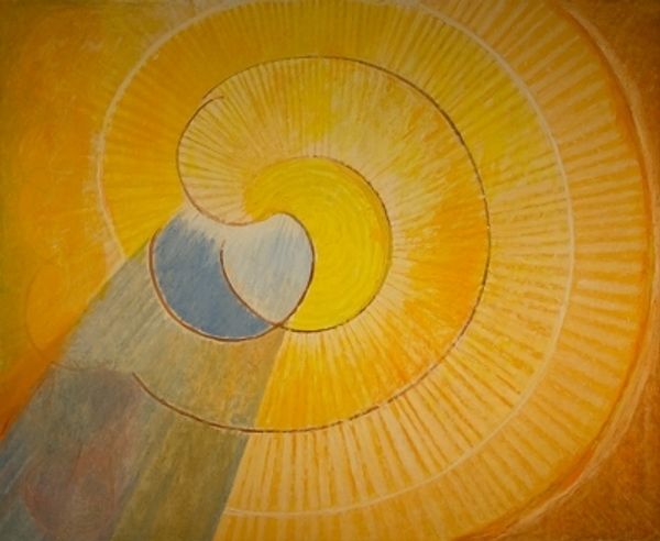 'The Music of Dawn' depicts a golden priestess dressed in flowing drapery and holding a pilgrim's staff, standing on the seashore. Collins believed that we are all pilgrims on a journey back to the Paradise that we once knew, and that one of the functions of art was to help us on this journey. From the 1960s onwards Collins painted grand images of angels as spiritual messengers of light and love. Here a golden light suffuses the scene as the dawn approaches. As well as being one of the last pictures that Collins painted, 'The Music of Dawn' was also one of the largest canvases of his last years. Gallery label, August 2004