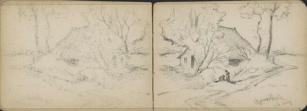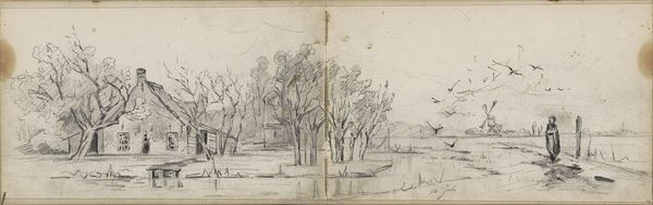 This is a pencil sketch of two figures by a bridge over a river, made by Willem Cornelis Rip. The artist's choice of pencil, a humble material readily available due to industrial production, speaks volumes. Unlike the laborious process of grinding pigments and mixing paints, a pencil allows for quick, immediate expression, capturing fleeting moments with ease. Notice the delicate gradations of tone, achieved through subtle variations in pressure. This immediate style emphasizes the direct connection between the artist's hand and the paper, revealing the artist’s thinking as he composes the landscape. The swift lines and tonal variations create an image that appears almost like a memory fading in and out. This work exemplifies the democratization of art materials, challenging the traditional hierarchy between high art and everyday practices. It reminds us that artistic expression isn't confined to precious materials, but can emerge from the simplest of means.