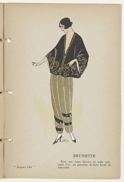 Curator: Here we have “Toujours Chic Les Tailleurs et Les Manteaux, Hiver 1921-1922: Zinnia,” a watercolor fashion illustration by G-P. Joumard, dating from the early 1920s. It’s currently held in the Rijksmuseum's collection. Editor: My immediate response is that she exudes this quiet defiance despite the very prescribed femininity in the clothes, like she's pushing against something. Curator: Definitely! The harlequin pattern of her dress disrupts any conventional expectation of fashionable refinement. Note also the Zinnia title. In the Victorian language of flowers, a zinnia often symbolized thoughts of an absent friend, but could also mean lasting affection and remembrance. Considering that, do you feel this symbolism ties in with her subtle act of defiance you've noted? Editor: I hadn’t considered the floral symbolism! With that in mind, the illustration becomes really compelling as a post-war statement, as if it is encapsulating a time of deep grief and reconstruction. Perhaps Joumard wanted to highlight women finding new and slightly subversive ways to carry themselves after a period of mourning. Curator: That is such an interesting idea about its resonance with the post-war experience and the evolving social codes around that period. I'm fascinated by how her almost severe gaze contrasts with the soft rendering of the fur and the slight iridescence of the watercolor. It has an undeniably magnetic pull to it, despite its relative simplicity. Editor: Absolutely, it’s that contradiction between the softness and severity which gives it such emotional heft! It makes me consider what the illustration aimed to embody about this historical moment and about female identity. It presents a very modern, yet vulnerable, figure to consider. Curator: It’s a valuable example of the interplay between societal expression and individual representation within this moment. Thank you for lending me your ideas. Editor: Thank you, this artwork is compelling for uncovering historical and political complexities while prompting new reflection and insights.