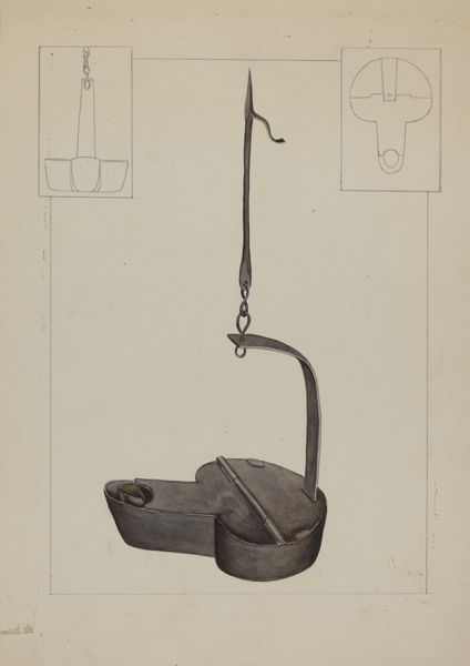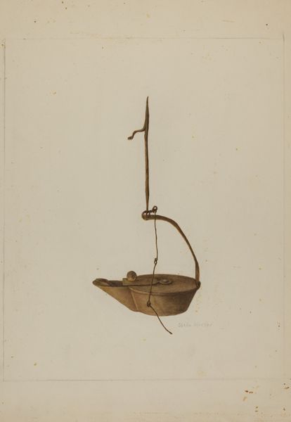 Curator: Welcome. Before us hangs a delicate study in graphite, titled “Betty Lamp.” Though the artist is currently listed as anonymous, we can say that the work was likely created between 1935 and 1942. Editor: Oh, wow. There's something almost… lonely about this piece, isn't there? It’s just this solitary lamp, hanging in an infinite off-white space. It makes me think of forgotten heirlooms in an attic, holding stories we can no longer quite grasp. Curator: I appreciate your emotional read. Note how the artist uses subtle tonal shifts to define the object's form, achieving a remarkable degree of realism. Consider the textures, too, particularly the nuanced gradations on the lamp’s body. They suggest a burnished, metallic quality. Editor: Absolutely. I also think that realism lends a feeling of groundedness in contrast with the way the lamp just floats on the paper. You get so much about a common household object, transformed with a touch of the sublime. Curator: Observe, furthermore, how the composition emphasizes verticality and suspension. The lamp's hook and the stem above create an axis mundi, bisecting the blank canvas and hinting at higher cosmological realms within this simple device. Editor: That's interesting. I mostly see the everyday purpose here. It’s humble, sturdy. Even the upward spike and the curve feel so human somehow: ambition paired with nurturing warmth. Someone relied on that light, poured fuel into it. It’s lovely! Curator: A functionalist perspective certainly grants another interpretation. Still, within this minimalist rendering, we may yet identify potent allegories. For the artist, and for ourselves. Editor: Perhaps. To me it's a bit of history, caught on paper in a brief, flickering glow, then nearly fading again into the paper. Curator: Indeed. These faint graphite traces bear witness to history even as they articulate aesthetic possibility. A potent pairing, wouldn’t you say?