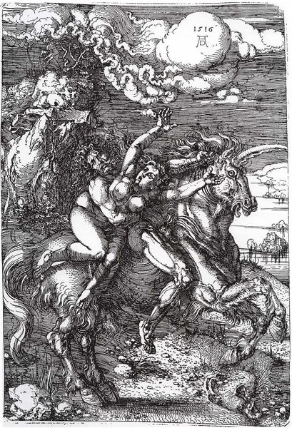 Curator: Here we have Piero di Cosimo's painting, *Allegory*, from around 1500. It’s an oil painting depicting a winged figure, a horse, and another figure lying in the water. What strikes you initially? Editor: Well, the colour is surprisingly subdued, almost muted, for an Italian Renaissance painting. The grey of the horse dominates, contrasting oddly with that theatrical slash of red drapery. And is that… oil paint on wood? I'm curious about the preparation that went into creating such an odd set of colours and textures. Curator: The imagery, though, invites interpretation. The winged figure clearly echoes classical allegorical depictions, holding the reins of a powerful steed and what looks to be like rope almost as an instrument of control. Perhaps it’s a symbol for how reason governs instinct? Editor: Or is it? What is the link between her actions and the prone figure half submerged in the foreground? It’s tempting to focus on that winged character – an easy visual shortcut – when, I wonder, if Cosimo is asking about female bodies at a specific socio-economic moment and the material and social means of their exploitation? The horse's power against the fragility of her body… it feels deliberate. Curator: And consider the Italian Renaissance context. Piero di Cosimo was a contemporary of Leonardo and Michelangelo. Mythological allegories served as visual embodiments of humanist values, reflecting the renewed interest in classical antiquity. The scene seems rooted in mythology; it does echo tales of taming mythical creatures. It brings to mind that idea of humanity striving to master and understand the world through reason. Editor: Perhaps. But it still comes down to how, and with what means, such 'mastery' comes about, even in the visual arts. Were women simply models to work upon? Were they partners in meaning-making? Curator: It seems those answers still lie in exploring how he deploys imagery that, while rooted in humanism and classical tradition, is still highly personal. Editor: And, from my angle, only ever arrived into being because of material acts in specific working and living conditions! Interesting how he uses a subtle palette and that stark red drape to both reveal and perhaps obscure the figures’ allegorical roles in all of this. Curator: Yes, it seems that even after all these centuries, di Cosimo still keeps us thinking about control, knowledge and creation through very interesting methods. Editor: Methods with human consequence that continue to echo today!