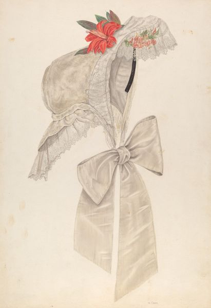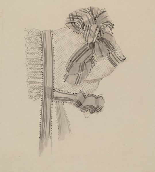 Rosalia Lane created this "Bonnet" with pen and ink and watercolor. At first glance, it's a charming fashion plate, but look closer and you will notice the artist has chosen an unusual medium with which to portray an everyday object. The delicate lines of ink define the form of the bonnet, from the brim to the ribbons, with an amazing economy of gesture, and only minimal watercolor added. The choice to depict such an object of labor through the use of line makes me question the value of production at this time in history. Notice how the artist's skillful handling of these basic materials transforms something so mundane into a work of art that transcends its original purpose. Lane elevates the status of the bonnet, encouraging us to appreciate not only the artistry of its design but also the social history of the textile industry itself.