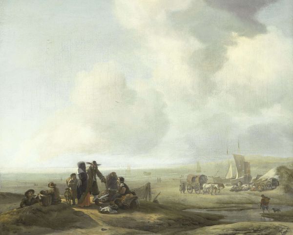 Editor: This is "Bivouac at Molodechno, 3-4 December 1812: an episode from Napoleon's Retreat from Russia," painted by Johannes Hari in 1816. The desaturated oil paint gives a desolate feel, almost like looking at a faded photograph. What do you see in this piece? Curator: I see layers of symbolic significance built upon a foundation of human suffering. The frozen landscape is more than just a setting; it's a metaphor for the frozen hopes and dreams of Napoleon's retreating army. Note how the artist has rendered the fire, a small point of warmth, yet it’s surrounded by immense cold – representing fleeting hope amidst overwhelming despair. Editor: So, the fire represents hope, however small? Curator: Precisely. Fire has always been a potent symbol of life, warmth, and civilization. In this context, though, it highlights the vulnerability of these soldiers. Notice too, how Hari uses a pyramidal composition anchored by that very fire? Pyramids in art often convey stability, but here it feels ironic, almost mocking. The actual pyramid is straw which could burst into flame. Is that not also evocative, metaphorically, of the fate of those at Molodechno? Editor: I never thought of the straw bale as a pyramid. Curator: Consider the placement of figures, too. The two soldiers huddled closest to the flames are set apart, almost iconic, aren't they? Consider their uniforms: These men are officers in a time of chaos. What do those men represent, in contrast to the suffering infantry? Editor: It is hard to decide which element carries the most emotion; each aspect reinforces the others to create an overwhelming feeling of dread. Curator: The painting is a powerful visual text on loss, resilience, and the cruel indifference of history. Understanding its symbolic language allows us to engage with it on a much deeper level.