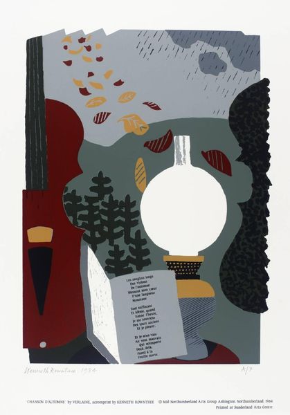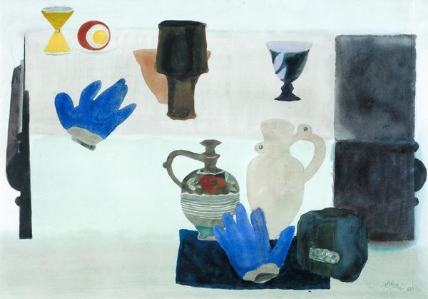 Editor: Ivan Eyre’s "Spring Brocade" from 2008. It's a very curious painting using acrylic, to me it evokes the feeling of nature and quiet contemplation, yet the figure is so strange. What do you make of it? Curator: Curious is right! For me, it feels like a waking dream. Notice how the interior and exterior landscapes blend, almost fighting for dominance. What do you think Eyre is trying to say about our connection with the natural world and the human psyche? I wonder if the stark black background is the inner self while everything inside the character figure are thoughts floating inside the head? Editor: That's a great perspective. The blending of inner and outer landscapes never occurred to me. It also seems like a loaded environmental statement for a painting entitled, "Spring Brocade." Curator: Indeed! Do you notice the peculiar shape cut out in the figure’s head? Editor: Oh, right. Like... bunny ears, or two diverging paths maybe? Curator: Or maybe how our thoughts are never neatly contained, always branching off in unexpected directions. What happens if one gets up from the table to engage the spring air? Will thoughts remain the same? Editor: This makes me look at that single coffee mug in an entirely different way, too! From the black, one may want to enjoy the blue mug and "go outside", and maybe "stay inside" at the same time? Curator: Precisely! Art's about these personal dialogues, wouldn’t you say? We can always carry pieces of Eyre's landscape with us while sitting inside. Editor: Absolutely! I initially just saw a figure with nature inside, now I see the endless possibilities of inner contemplation that an acrylic painting can achieve.