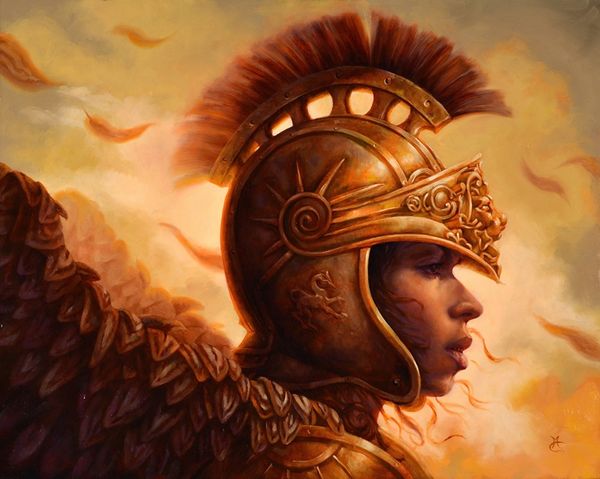 Michael Hayes’ “Huntress of the Sky” captures a woman with a falcon, rendered with a striking steampunk aesthetic. The falcon is the dominant visual symbol. It's an ancient emblem of nobility, freedom, and aspiration, revered across cultures from Pharaonic Egypt, where Horus, the falcon-headed god, symbolized divine kingship, to medieval Europe, where falconry was the sport of kings. We see echoes of this symbolism in other works across time; consider the equestrian statues of emperors, often accompanied by eagles, or Renaissance portraits featuring noblemen with falcons, symbols of their elevated status and mastery. Here, the falcon's presence evokes a sense of empowerment and connection to the natural world. The woman's upward gaze suggests a yearning for the sublime, the infinite, the transcendent. This yearning, this almost primordial connection to the divine and nature, continues to resurface, evolve, and take on new meanings in differing contexts.