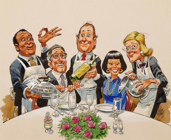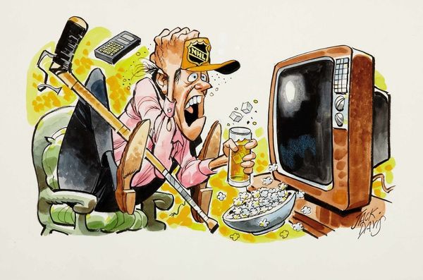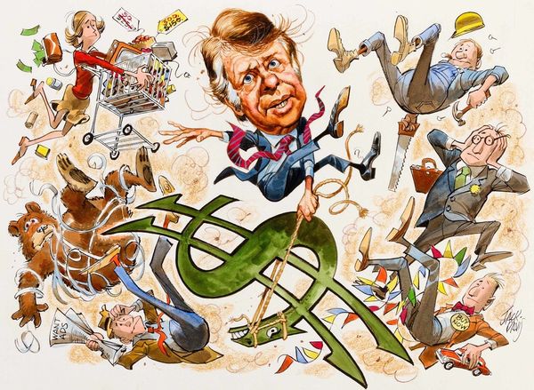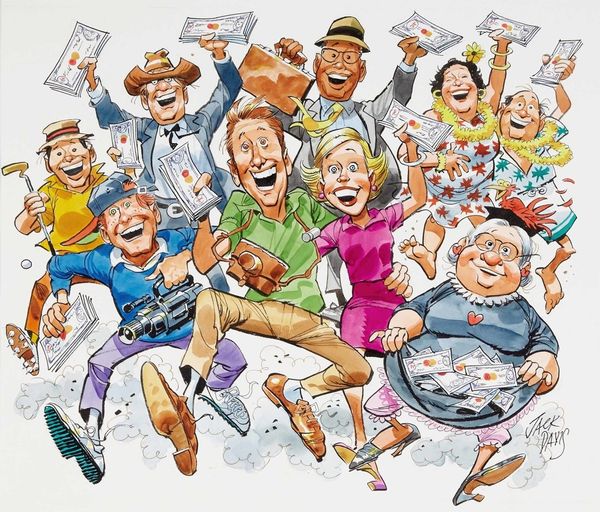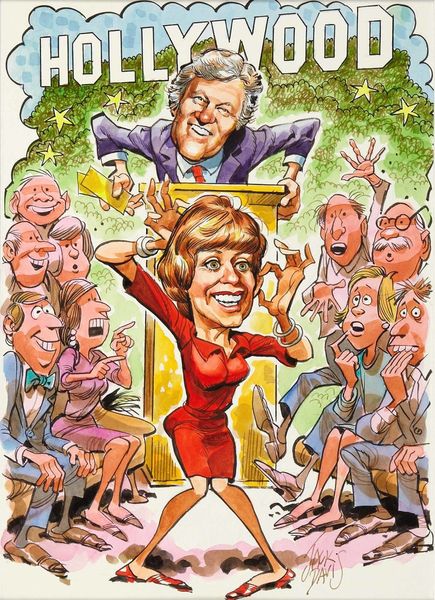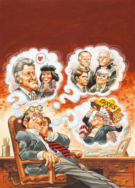 Jack Davis, the famed American cartoonist, created this illustration titled "Denials" with watercolor and ink. Davis, celebrated for his contributions to Mad magazine, demonstrates his expertise in caricature. This piece reveals the tactile quality of his artistic process, evident in the nuanced textures of the watercolor washes and the crisp outlines defined by ink. The material choices lend themselves perfectly to capturing the social commentary and the exaggerated expressions of the figures involved. Davis’s skillful use of line and color creates a sense of movement and energy, heightening the satire inherent in the cartoon's subject matter. The meticulous details, from the cross-hatching to the precise rendering of facial features, speak to Davis's training and craftsmanship as an illustrator. This work exemplifies how traditional drawing and painting techniques can be employed to create powerful visual narratives.