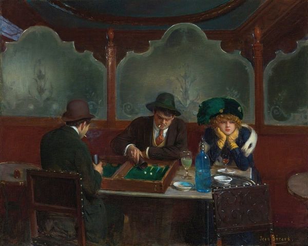 Curator: This is Jean Béraud’s “Au café, dit l’Absinthe,” painted in 1909. It’s an oil on canvas that depicts a rather tense-looking couple at a cafe. Editor: My first thought is that the mood in this painting is quite somber and thick, like the air hangs heavy between these two. It almost feels like overhearing a conversation you wish you hadn't. Curator: I think you’re spot on with the atmosphere. Béraud often depicted Parisian life, especially the social interactions within the city. This scene feels incredibly modern, capturing a specific kind of urban alienation. It's a world of private struggles being played out in very public places. Editor: There's something so striking about the woman’s vacant gaze, she’s right next to the man, but worlds apart. Her elaborate hat is fascinating too, it seems like she’s dressing the part for a public stage even if her spirit feels quite dimmed. Do you think the choice of setting, the cafe, plays into the theme of the artwork? Curator: Absolutely, the café in late 19th and early 20th century Paris was a stage in itself, a crucial social hub for the modern flaneur and flaneuse. But there's a strong undercurrent of isolation as well. People were perhaps more connected physically but the individual disconnection seemed amplified, heightened in a public venue, like a counterpoint. It's hard to tell what happened before or what’s about to come but everything just sits stagnant in this snapshot. Editor: You can really feel the sense of transition captured here, with the style and details walking a line between Impressionism and Realism, showing both an intimate and impersonal relationship between these people and with their social surroundings. Is it meant to portray their psychological isolation from each other, or perhaps highlight certain issues during that time? Curator: It is believed that alcoholism, especially the abuse of absinthe, was on the rise in French society during that time. This artwork may simply represent this new social phenomenon that’s taking place in a public venue as a place for social interaction and an individual disconnect with each other at the same time. Editor: Indeed, “Au cafe, dit l’Absinthe” offers a fascinating study into modern alienation amidst the backdrop of Parisian cafe society. Curator: Béraud's painting prompts reflections on the complexity of human connection, and how societal spaces are constantly shifting.