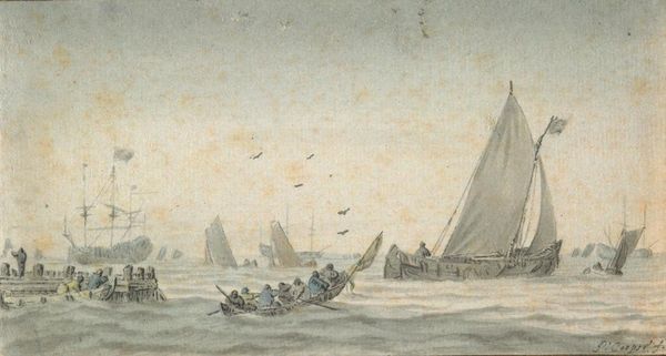 Editor: Here we have Pieter Coopse's "Seascape," of indeterminate date, at the Harvard Art Museums. It's a very small watercolor, and the ships give it an almost desolate feeling. What strikes you when you look at it? Curator: Initially, the composition, defined by a horizontal orientation. Observe how Coopse organizes the ships in receding planes, creating spatial depth. Editor: Yes, and the figures in the foreground provide scale. The artist’s rendering is so skillful! Curator: Precisely. The brushstrokes demonstrate considerable technical prowess. Did you notice the restrained palette, the limited range of muted tones? Editor: I did, and it enhances that somber atmosphere that I felt so keenly. Thanks for pointing that out! Curator: My pleasure. Examining its formal elements illuminates the artwork.