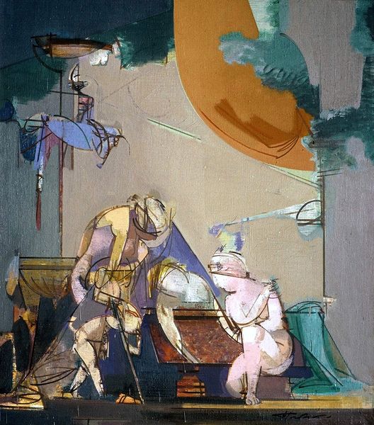 Dmytro Kavsan created "Attempt to Minuet on the Ruins", although we are not certain of the exact date. Kavsan emerged as an artist during a period of significant social and political transition in Ukraine, following the collapse of the Soviet Union. This painting is a kind of theater of historical memory. Kavsan juxtaposes classical architectural elements with surreal, cartoonish figures. These figures seem to dance or perhaps stumble through the ruins of a once-grand space. The minuet, a graceful dance, is set against a backdrop of decay, creating a tension that speaks to broader themes of cultural identity and historical change. I wonder if Kavsan is questioning the impulse to preserve traditions within societies undergoing upheaval. Are the ruins a symbol of the Soviet past, and the minuet an attempt to reconcile with or perhaps escape from that history? The painting evokes a sense of displacement, a feeling of trying to find one's footing in a world that has been irrevocably altered. It asks us to consider how we engage with our own histories, and what it means to create art in the face of societal transformation.