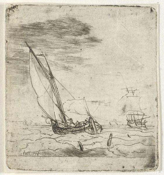 Editor: Here we have Susanna Duncombe’s "Coastal Scene with Two Sailing Boats at Anchor and Three Figures on the Shore," a tiny drawing held at the Tate. The composition feels so carefully arranged, almost staged. What do you see in the starkness of the scene? Curator: The most compelling aspect is the interplay of lines and shapes. Observe how the masts create strong vertical lines, juxtaposed with the horizontal emphasis of the shore. This contrast creates a visual tension, a dialogue between stability and aspiration. Do you perceive any rhythmic qualities in the repeated triangular forms of the sails? Editor: I do, now that you point it out. So, it's less about the subject, and more about the shapes? Curator: Precisely. The subject matter serves as a vehicle for exploring formal relationships – the balance, rhythm, and harmony achieved through line and form. This is where the artwork’s true essence resides. Editor: Thanks for illuminating that. I’ll never look at a boat the same way! Curator: Indeed, art invites us to see beyond the surface and engage with the underlying structure of visual experience.