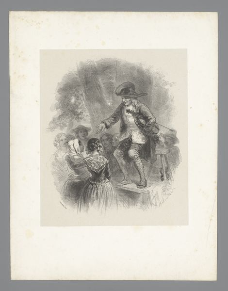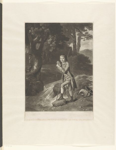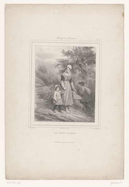 Editor: Here we have "Woodcutter with his dog," a print by Johannes Christiaan d' Arnaud Gerkens, made sometime between 1840 and 1843. I’m immediately struck by the isolation of the figures, just this man and his dog in what appears to be a harsh winter landscape. What are your thoughts about it? Curator: The work offers us a fascinating window into the romanticized view of rural life popular during that period. Genre paintings, like this one, were often commissioned and collected by the urban bourgeoisie. Do you notice how the woodcutter, though seemingly engaged in hard labor, is presented almost theatrically, with a certain picturesque charm rather than gritty realism? Editor: I see what you mean. His clothing isn’t really the rugged work gear I’d expect. Curator: Exactly. It's important to remember that art is never created in a vacuum. How do you think social class plays into this image? The romanticised portrayal could reflect the commissioner's distance from and perhaps idealized understanding of rural labour. The dog, often a symbol of loyalty and companionship, humanizes him and further softens any potential harshness. Editor: So, it’s not really about the woodcutter's actual experience, but more about what wealthy people *wanted* to see? A constructed narrative. Curator: Precisely. Consider the socio-economic conditions of the time: increasing industrialization, urbanization and rural depopulation. Works like this might have offered a nostalgic refuge, a way to connect with a disappearing way of life – albeit a highly stylized one. Editor: I never considered the way urbanization might shape these images. Curator: Art is never neutral. Reflecting on the public role of this imagery lets us think about its function in shaping social and cultural attitudes towards labor and class at the time. Editor: This has completely changed how I view this print! Thanks for sharing these insights.