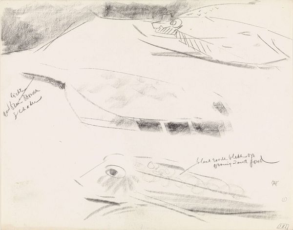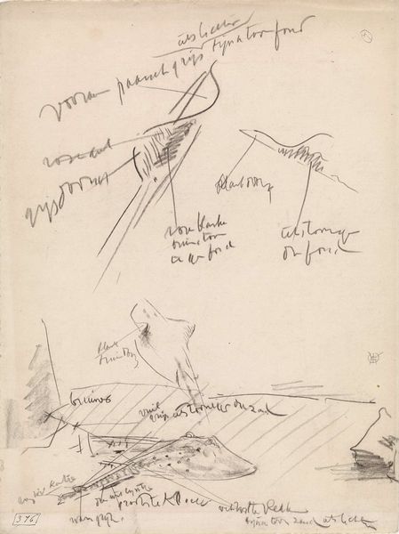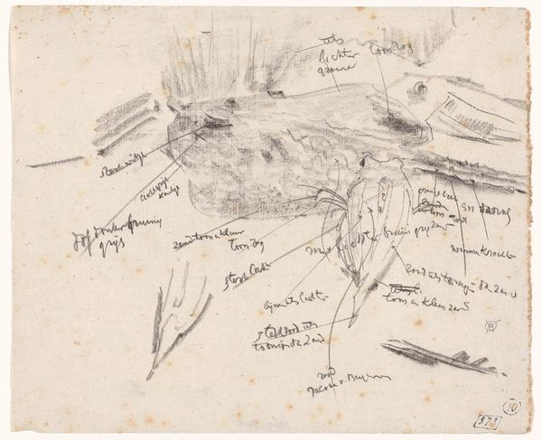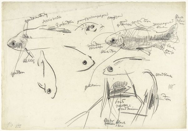 Curator: At first glance, this drawing feels… well, like a half-remembered dream about fishing. It's loose, quick, all scribbles and suggestions, yet… something about it hooks you, doesn't it? Editor: Absolutely. There's an immediacy to these studies that speaks volumes about the artist's process. These “Studies van een vis, met kleurnotities,” made with graphite and ink on paper, likely created sometime between 1876 and 1924 by Gerrit Willem Dijsselhof, are currently housed right here at the Rijksmuseum. The artwork captures not just the likeness, but the essence of form. Curator: Exactly! It’s Dijsselhof thinking aloud, with lines, about a fish! Did he see its gills flutter? How its scales shimmered in the light? He’s got these color notes scrawled around... Imagine him, sitting by the water, notebook in hand, trying to lasso that slippery essence with his pen. Editor: And what about the ecological implications? Was this an act of reverence, studying and archiving the natural world around him? Or something else. Was Dijsselhof conscious about how human activity, specifically industry at this time, impacted these very species? Perhaps not directly depicted but there's a political charge to choosing these everyday subjects at the margins... Curator: Interesting. Maybe it’s not so simple. I can tell you for certain that to me it whispers of curiosity more than conservation, an intense appreciation, which, don't get me wrong, is always inherently connected. Editor: Right, though it also has a connection to art history more broadly, with echoes of the Ashcan School. Curator: Hmm, in its directness, certainly. There's no pretense here, no lofty allegories. This is just…fish. Dijsselhof loved exploring ornament, craft… he’s a fascinating character. He even designed furniture. I feel like he just needed to figure this fish out. Its 'fishness'. Editor: Ultimately, what resonates for me is its potential for broader discussions, not just about nature and preservation, but the act of seeing. What we choose to focus on and preserve... Curator: And the sheer joy of observing the world! These little marks, so unassuming, become a testament to that joy. Thanks Dijsselhof. I feel lighter having pondered on a simple fish!