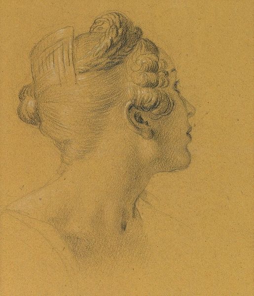 Curator: Here we have "Detail of a Sibyl, after Raphael, Santa Maria della Pace," attributed to August Temmel, a study in red chalk. The dimensions are approximately 60 by 44 centimeters. Editor: My first thought is about the color. That warm, reddish-brown feels like old parchment, lending a sense of history and quiet contemplation. Curator: Indeed. Temmel focuses on form through line and shading. Note the meticulous cross-hatching that defines the drapery and musculature. The composition directs the eye upwards, inviting speculation about her gaze. Editor: It’s funny, isn’t it? How a simple headscarf, rendered so carefully, manages to convey both humility and an almost regal dignity? Curator: Precisely. The interplay of classical idealism and the artist's technical skill is compelling. Editor: It’s like a whisper from the past, reminding us that even fragments can hold profound beauty. Curator: A potent reminder of the enduring power of classical forms, I'd say.