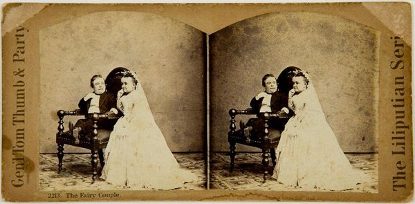 Curator: This stereograph, attributed to Mathew Brady, is titled "The Fairy Wedding Party. Mr. & Mrs. Genl. Tom Thumb, Commodore Nutt, Minnie Warren." Editor: Wow, there's something both enchanting and unsettling about this. Like a dream, but tinted with sepia. Curator: Indeed. The photograph captures the wedding party of General Tom Thumb, a celebrated performer, reflecting a fascination with the spectacle of difference in the mid-19th century. The image, however, also prompts discussions of representation and agency. Editor: I find myself wondering what it felt like to be on the other side of Brady's lens, so exposed, so celebrated, and perhaps, so misunderstood. It makes me want to write a poem. Curator: It's a complicated image, isn't it? One that invites us to question the ethics of spectacle and the narratives we construct around identity. Editor: Absolutely. It’s a conversation starter, wrapped in a very pretty, if melancholic, package.