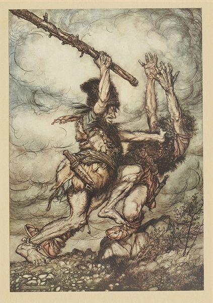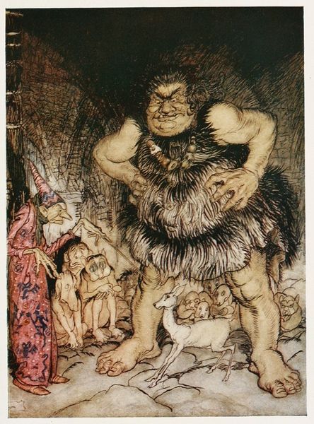 Arthur Rackham made this illustration, ‘To my hammer’s swing Hitherward sweep Vapours and fogs!’, in 1919, with an eye for dramatic detail. It's so cool to see how he builds atmosphere with these wispy, almost watercolour-like washes of colour, contrasted with the very crisp, precise pen lines, especially in the figure’s cloak and beard. Rackham's use of ink is really something here, the way he defines the textures, from the fur to the rocky outcrop, its all so tactile. Then, the touches of muted colour, peach and rust, add such a sense of depth, but it's the penwork that really grabs me. Look at the swirling lines in the sky, building up this ominous feeling of a storm brewing. And it’s the details that make it; the figure’s clenched fist, the way his cloak seems to billow even though there's no wind. He reminds me a bit of Aubrey Beardsley, both these artists share this amazing sense of line. Like a conversation, Rackham's piece keeps asking us questions and embracing the mystery of what we see.