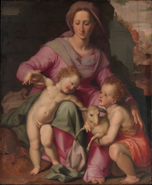 Curator: Well, hello there! Looking at this canvas, I’m immediately struck by the kind of subdued drama. The light seems to linger on faces, inviting you in to whisper secrets with them. What about you? What's your take right off the bat? Editor: There's a formal grace about this. It's a fascinating intersection of religious iconography and, perhaps, social portraiture, reminding me that even faith is visualized through cultural lenses. This is Jan Cossiers’ "The Mystic Marriage of St. Catherine," created around 1624. It certainly adheres to Baroque sensibilities. Curator: Baroque it is! The emotion is definitely heightened, swirling with significance, even if it is still relatively serene. What pulls at my attention, really, is the baby Jesus offering a ring to Saint Catherine. Talk about symbolic vows! A ring probably made of…gold? Editor: Indeed. This concept, common in religious art, portrays Saint Catherine's spiritual marriage to Christ. And I'd wager that ring is more than simple gold. It signifies divine commitment, a promise. We can trace the iconography’s popularity alongside shifts in socio-religious ideals—specifically, this elevated idea of mystical union was appealing in Counter-Reformation Europe. Curator: Right! And seeing it represented with such lush color, heavy fabrics…I can almost smell the incense and beeswax candles. Does that richness also feed into the political and spiritual theater of the time? The canvas seems to act almost like a stage for devotion. Editor: Absolutely! It is visual propaganda. These weren't just artistic choices; they played a direct role in the complex dynamic between spiritual authority and everyday experience. Think about the ways visual culture reinforced social structures. Did everyone have the possibility to even access these works of arts? Curator: Interesting that it speaks to authority, when the feeling for me, somehow, leans more intimate than monumental. Perhaps it's because of the scale? Editor: Perhaps the close proximity of the figures creates that sense of closeness. The oil paint, used to portray all this information, does it convey something specific in you? Curator: Yes, oil allows the soft skin tones, it glows. I feel it breathes an air of immediacy and sacredness all in the same breath! So... seeing how artists reflect historical tension in such an emotional manner makes you feel there's nothing new under the sun, doesn’t it? Editor: It certainly reinforces the vital point that what appears novel always arises from somewhere else—making both art and history into a dialogue of innovation and legacy.